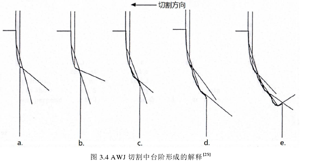Zeng 与 Kim 在 1992 年通过对脆性材料的切割过程的研究,提出了如下的模型以解释磨料水射流中的阶梯现象[25],整个过程如下:切割过程开始时,射流从右边开始给进材料,此时的切割是一个平滑的过程,直至射流束完全进入材料,如图 3.4a 所示,这一阶段的材料移除完全由初始射流造成,是一个稳定的阶段;此后随着射流的继续给进,在原始射流束后方(切割的反方向)的材料开始受到发生偏转后的射流的二次冲击,这导致了材料移除率的突然变化,因此切割前沿曲线也会跟着突然改变,这就是一个台阶形成的开始阶段,如图 3.4b;随后,由于射流会沿着该台阶的上表面偏转,该台阶开始变长,并成为其下方材料的保护层,但当该台阶成长到一定程度时,它所承受的射流的侵蚀能力超过了其强度,射流开始逐步移除其上表面的材料,至此一个稳定的台阶形状成型,并保持其外形逐步下移,如图 3.4c 所示;在上一步稳定的台阶成型并向下逐步移除的同时,射流还在向前给进,台阶前方的材料也会像该台阶的形成过程一样形成新的台阶并被稳定移除,并且随着射流的给进,前方的材料也会不断循环这一过程,如图3.4d 所示;但同时需要指出的是,新生成的台阶并不会马上与原有台阶合并成一条曲线,而是会从上至下逐渐覆盖原有台阶的形貌,当有多个台阶同时存在时,就会根据同一时刻承受射流移除更多的台阶形貌来改变整个切割前沿的形貌,如图 3.4e 所示。