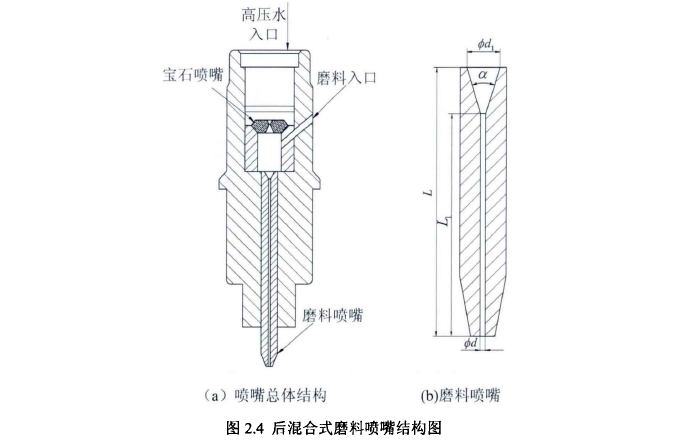 图2.4为后混合式磨料水射流切割喷嘴的整体结构。高压水从纯水喷头中进入混合腔内,同时磨料从混合腔侧面进入,二者在混合腔内混合后,经由磨料喷嘴加速,最后形成高速磨料水切割物体。后混合式切割系统的磨粒加速集中在喷嘴内部,而磨料的加速过程的充分与稳定是极其重要的,此过程中喷嘴的收敛角的大小、出口直径及喷嘴长度是决定射流束集中且切割性能的主要因素。